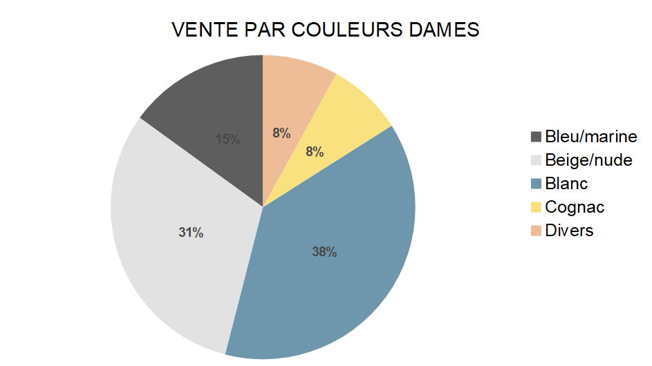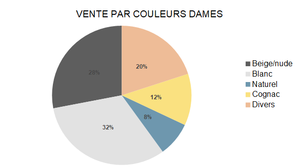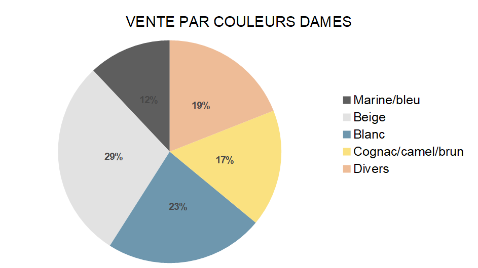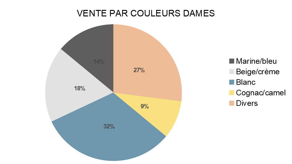 Le bleu, le marine, le beige, le naturel et le blanc, toutes des couleurs claires d'été, ont représenté plus de 80% du chiffre d'affaires chez les femmes. Même les hommes ont acheté du blanc et du bleu pour plus de 50%. Les enfants suivent...