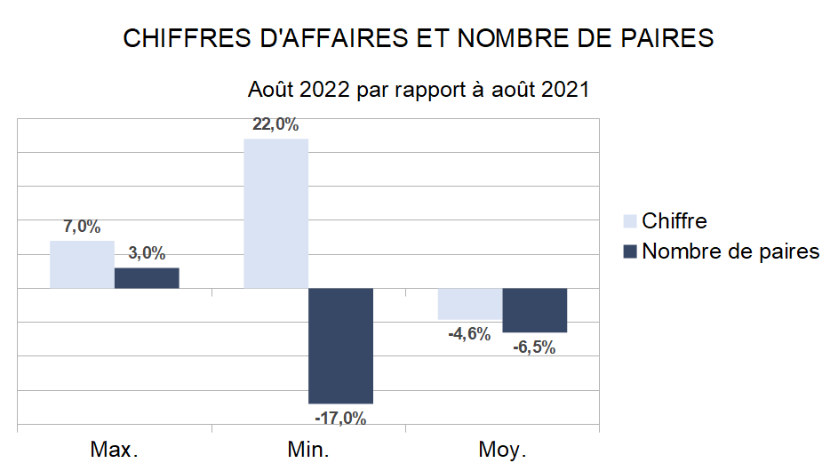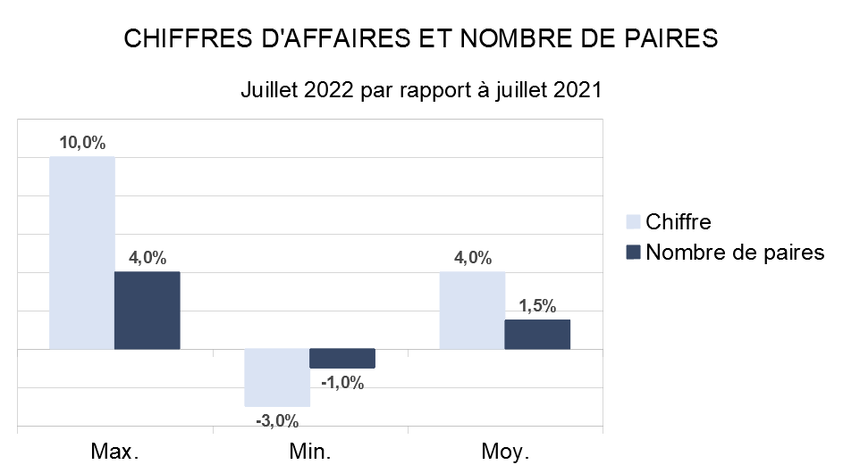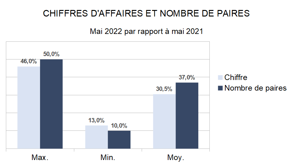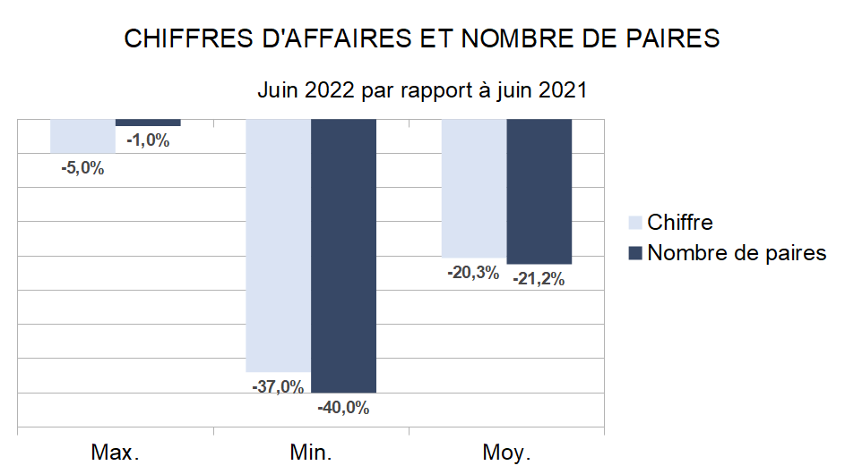 Au cours des six premiers mois de 2022, on a enregistré en moyenne 10,9% de chiffre d'affaires en plus et 8,1% de paires en plus par rapport à l'année dernière. Toutefois, si l'on compare avec 2019, on constate qu'en moyenne, 7,5% de chiffre d'affaires en moins ont été enregistrés.