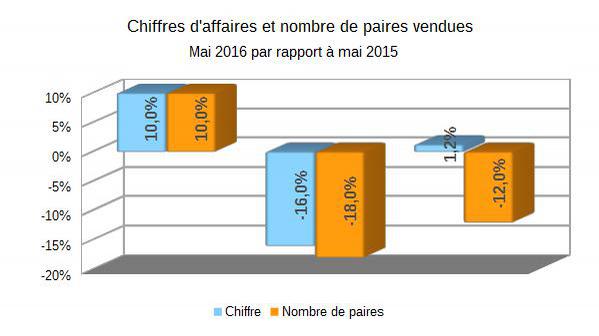 Quoi qu'il en soit, les chiffres cumulés pour les cinq premiers mois restent très négatifs et tournent autour de -8%, tant au niveau du chiffre d'affaires que du nombre de paires.