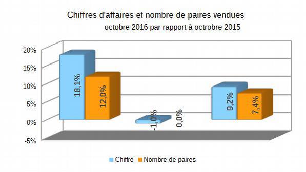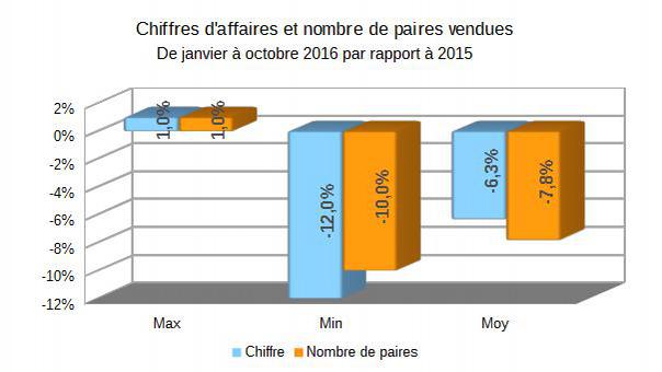 Ces chiffres se répercutent sur les résultats globaux de cette année, mais ils restent encore nettement sous la moyenne de l'année dernière. Fin octobre 2016, le chiffre d'affaires des dix premiers mois était inférieur de 6,3% à 2015, et le nombre de paires vendues est resté 7,8% sous la moyenne de l'année dernière.