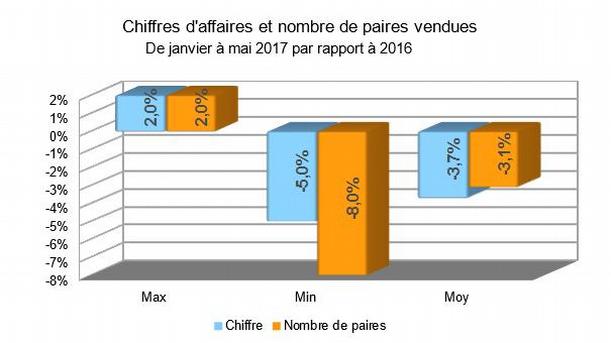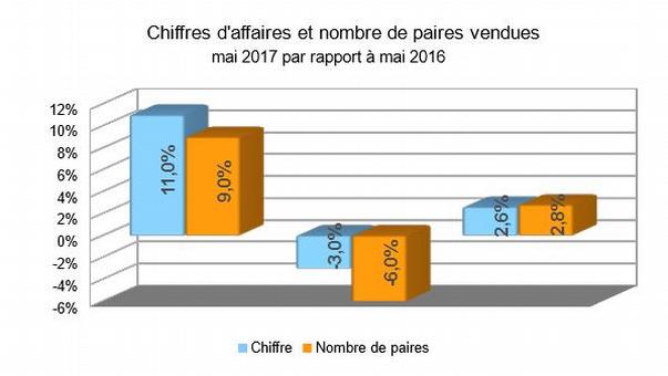 Le nombre de paires vendues en mai 2017 a également progressé de 2,8% par rapport à mai de l'année dernière. “Les conditions climatiques restent encore le principal facteur pour de bonnes ventes": tel est le commentaire de la majorité des détaillants qui collaborent à cette enquête. Les résultats favorables étaient toutefois insuffisants pour compenser les pertes des mois précédents de 2017. Le secteur accuse toujours un retard de 3,7% durant les cinq premiers mois de l'année sur les résultats de la même période de l'année dernière.