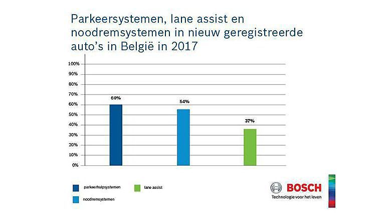 Of het nu gaat om automatische parkeerhulpsystemen, rijstrookassistentie of vermoeidheidsdetectie: wie vandaag een nieuwe auto koopt, maakt grote kans dat een van deze rijhulpsystemen standaarduitrusting is. De installatieratio van rijhulpsystemen blijft toenemen in Europa. Rijhulpsystemen zijn niet langer meer een exclusiviteit voor luxeauto’s, ook steeds meer middenklassemodellen zijn met een of meer rijhulpsystemen uitgerust. Dat blijkt uit een door Bosch uitgevoerde analyse in acht Europese landen van de installatie van rijhulpsystemen bij nieuw geregistreerde auto’s in 2017. Parkeerhulpsystemen blijven in België erg populair, met een installatiegraad van 60 procent. Ook noodremsystemen doen het in België erg goed. Parkeerhulpsystemen staan op de eerste plaats in de lijst van meest voorkomende rijhulpsystemen. Daarna volgen de automatische noodremsystemen. Deze helpen een dreigend ongeval te voorkomen of de gevolgen ervan te verzachten. De Europese Unie werkt momenteel aan een regelgeving die automatische noodremsystemen verplicht maakt. België geeft alvast het goede voorbeeld. In 2017 waren 54 procent van de nieuw geregistreerde auto’s uitgerust met een automatisch noodremsysteem. Hiermee is België koploper in de lijst van acht onderzochte landen.