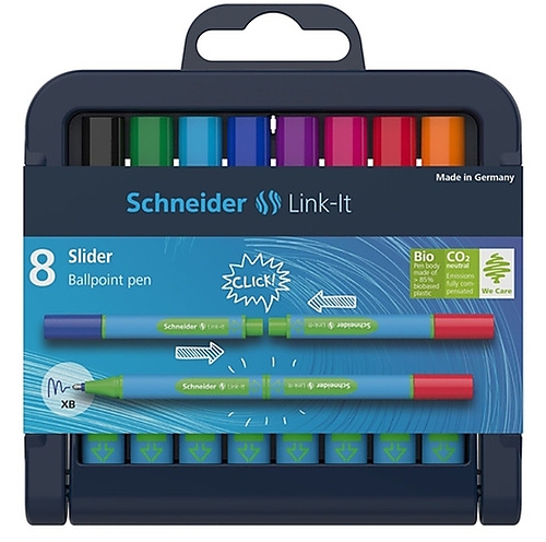 De kleurrijke teamspelers zijn verpakt in een verstelbare etuibox. Ingevouwen past het gemakkelijk in elke schooltas of handtas. De verstelbare etuiboxen zijn verkrijgbaar met fineliner, fiberpennen en nu ook met Slider-balpennen. Voor diegenen die hun eigen individuele doos willen maken, biedt Schneider ook ongevulde vakken voor 8 pennen voor individuele mixen en matchen. De verstelbare etui is tevens ecologievriendelijk.