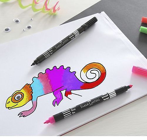 Nieuw zijn de viltstiften duo in neon kleuren. De brede punt is voor het sneller inkleuren en de smalle punt voor het fijne lijnwerk. De inkt is op waterbasis en uitwasbaar uit de meeste textielsoorten. Verkrijgbaar in een etui met 10 stuks.