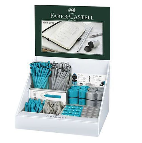 Nieuw is ook de Grip 2001 display in de kleuren turkoois en zilver met 120 Grippotloden, puntenslijpers en driehoeksgummen in hoogwaardige kwaliteit die geen veegvlekken geven.