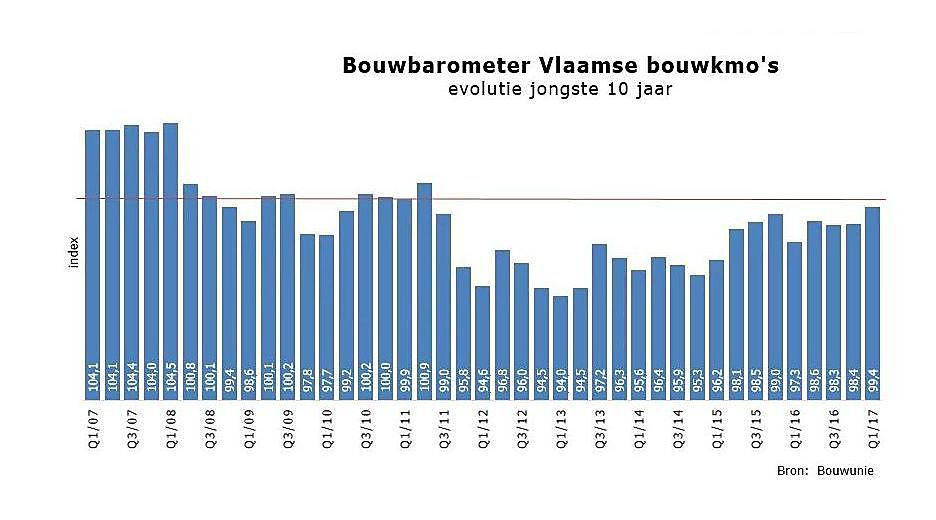 De bouwbarometer scoorde in het eerste kwartaal van 2017 met 99,4 beter dan eind 2016 met 98,4. Zoals op de grafiek te zien, groeit het vertrouwen in een economisch herstel. Waarden onder index 100 wijzen op een negatief evoluerende conjunctuur, maar de gezonde grens van 100 komt duidelijk dichterbij. 35% van de 300 bevraagde Vlaamse bouwondernemers heeft nu meer werk dan in het vorige kwartaal. Slechts één op vijf heeft minder werk en dat is beter dan verwacht. Bijgevolg heeft een groot aandeel van de bouwondernemers nog werk voor de komende negen maanden. Opvallend is daarbij dat de meeste bouwondernemers de toekomst positiever inschatten dan de voorbije periode. 24% ziet de rendabiliteit in de volgende maanden verbeteren en ook het personeelsbestand lijkt eerder toe te nemen dan in te krimpen. Eén op vijf zal extra mensen aanwerven terwijl maar 10% met minder werknemers zal verdergaan. De daling van de tewerkstelling uit de voorbije jaren, lijkt daarmee te zijn gestopt. Algemeen wordt de economische toestand neutraal ingeschat en is de helft van de ondervraagde ondernemers tevreden met het eigen bedrijf. Dat is een pak beter dan vorig jaar. Toch bestaan er ook twijfels. Vooral de concurrentie van en met goedkopere buitenlandse krachten plaatst de prijzen en de Vlaamse tewerkstelling onder druk. Daardoor kan slechts 48% van de bouwbedrijven met winstgevende prijzen werken. Ook het aantal slechte betalers blijft hoog en neemt volgens 1 op 4 enkel toe.
