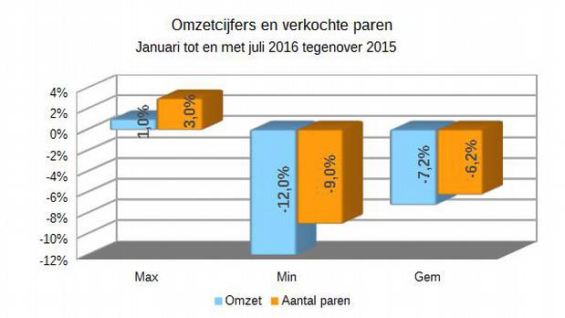 Dat vertaalt zich natuurlijk ook in de schoenenverkoop, die vrij onregelmatig verliep, maar waarover men toch relatief tevreden is in de sector. Omzet + 1,8% en aantal paren + 1,1% is niet zo schitterend. Deze kleine gemiddelde omzetstijging ten opzichte van juli vorig jaar doet het algemene verlies van het eerste semester lichtjes dalen, maar toch blijft het allesbehalve prettig: op 31 juli 2016 werd er 7,2% minder omzet gerealiseerd en werden er 6,2% minder paren verkocht dan tijdens de eerste zeven maanden van vorig jaar. Het wordt nog zwoegen en bidden om die percentages tegen 31 december nog te kunnen opkrikken. Aan de kust en in de toeristische steden waren de resultaten blijkbaar iets beter dan in de rest van het land.