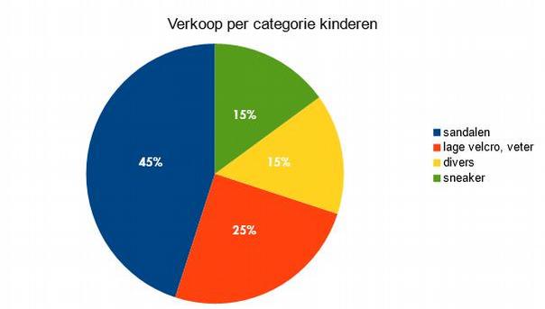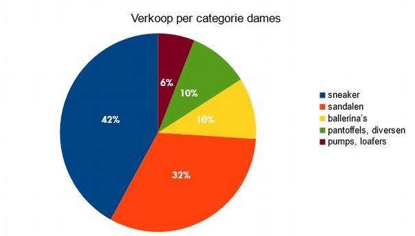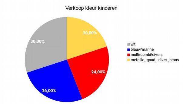 De heren kochten ook vooral cognac (38%) en blauw (31%), en ook bij deze kopersgroep kwam zwart met 19% pas op de derde plaats.En voor de kinderen ook allemaal lichte kleuren wat de klok slaat: blauw (26%), wit (30%) en metallics (20%) gaan ook hier met het leeuwendeel lopen.Wat de modellen betreft, zal niemand verbaasd zijn dat sneakers en casual sport het bij de dames uitstekend doen, goed voor 42% van de omzet. Sneakers zijn blijkbaar de enige modellen die door alle leeftijden en kopersgroepen gedragen worden.
