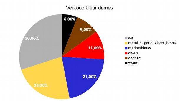 Merkwaardig verschijnsel: in mei 2017 lagen de verkooppercentages van de diverse kopersgroepen precies op hetzelfde niveau als vorig jaar: de dames waren goed voor 60% van de omzet, de heren voor 17% en de kinderen 23%. Opvallend is de grote unanimiteit, over het gehele land, van de verkochte modellen en kleuren. Bij de dames zijn wit (30%), blauw (21%) en diverse metallics (23) samen goed voor drie paar op de vier. De verkoop van zwarte schoenen was in mei 2017 bijna te verwaarlozen (6%).