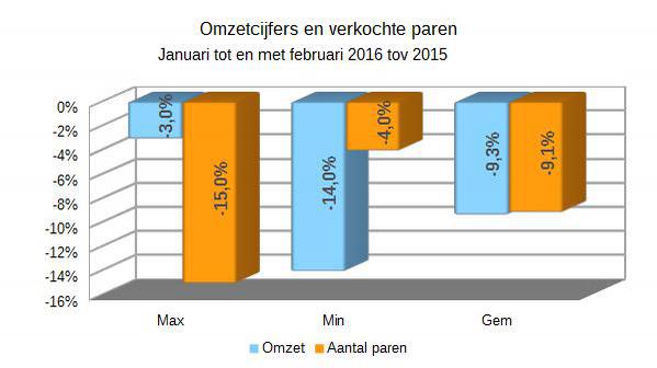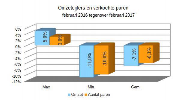 uit dan eind februari vorig jaar. Toen sloten we de eerste twee maanden nog af met een omzet van +1,7% en werden er 2,4% meer paren verkocht dan het jaar voordien. Volgens het KMI was februari 2017 een 'normale' maand, die op alle gebied weinig afweek van het langjarige gemiddelde: iets zachter, maar ook iets somberder, met 19 dagen neerslag en enkele uren minder zonneschijn.