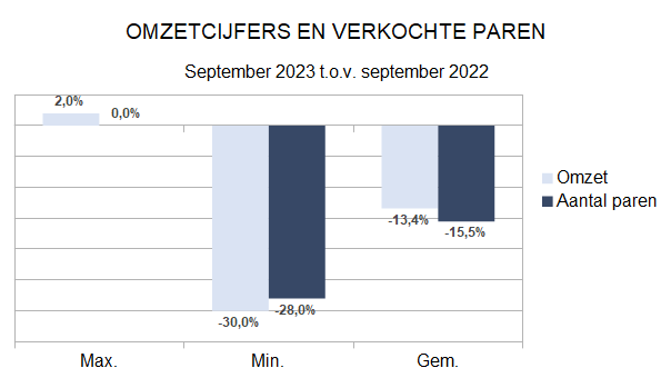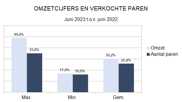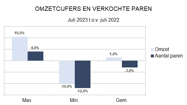 Als we de gemiddelde omzet in de schoendetailhandel tijdens de eerste zes maanden van 2023 bekijken, stellen we vast dat deze gemiddeld 2% beter is dan tijdens dezelfde periode vorig jaar. Daartegenover staat dat het aantal verkochte paren zo'n 3,4% lager ligt dan in 2022, en dat is eenvoudig te verklaren door het feit dat de schoenen gemiddeld 5% duurder geworden zijn dan twee seizoenen geleden.